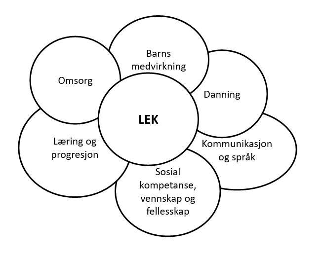 Barnehagens innhold skal være allsidig, variert og tilpasset enkeltbarnet og barnegruppen. I barnehagen skal barna få leke og utfolde skaperglede, undring og utforskertrang. Arbeidet med omsorg, lek, læring, danning, sosial kompetanse og kommunikasjon og språk skal ses i sammenheng og samlet bidra til barns allsidige utvikling. Barns medvirkning skal være et bærende prinsipp i planlegging, gjennomføring, vurdering og evaluering av barnehagens innhold (Rammeplan 2017).