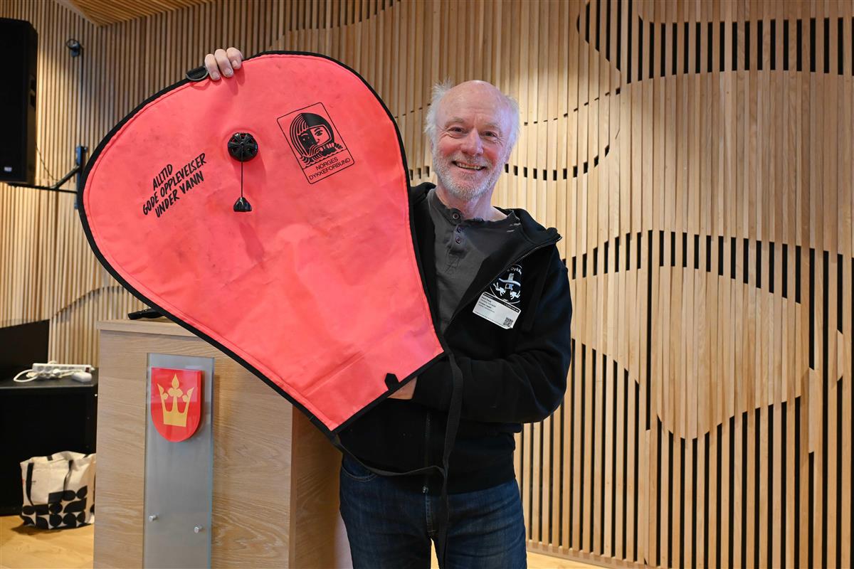 Bård Haug i Tønsberg dykkerklubb viser frem ballongen de bruker til å sende spøkelsesteiner opp til overflaten