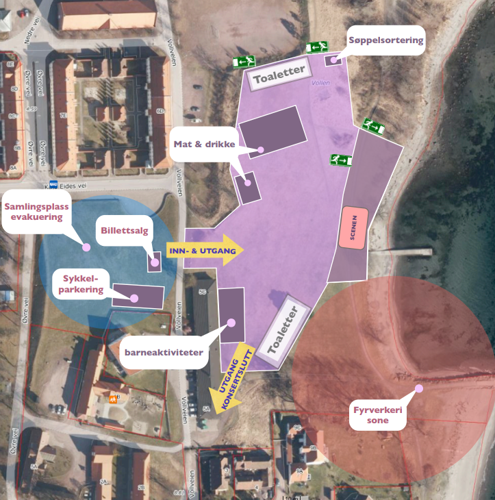 Det vil være mulig å benytte seg av to utganger etter konserten - hovedinngangen og i sørenden av arenaen (oppe ved Volleveien borettslag). Utgangene er skiltet.